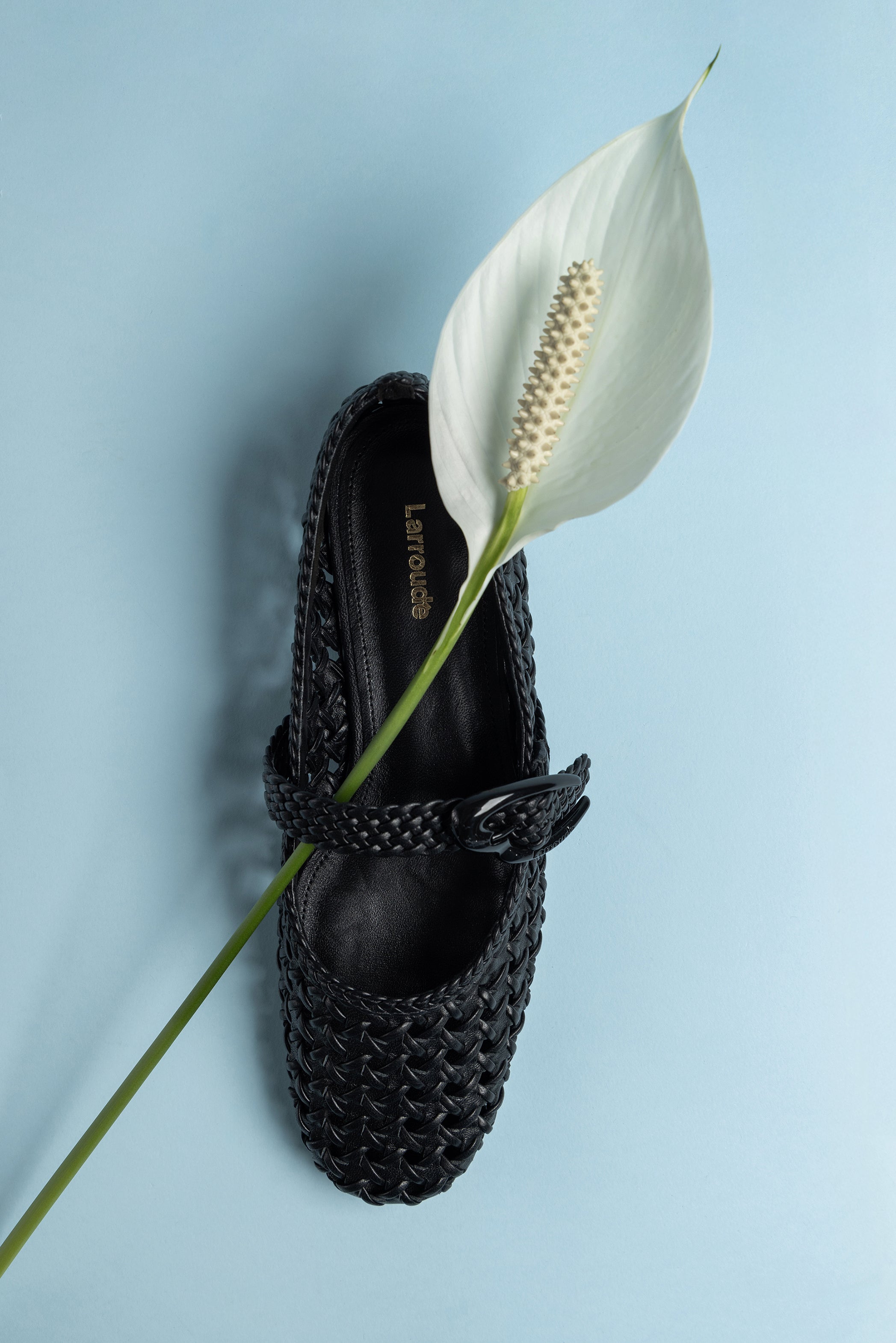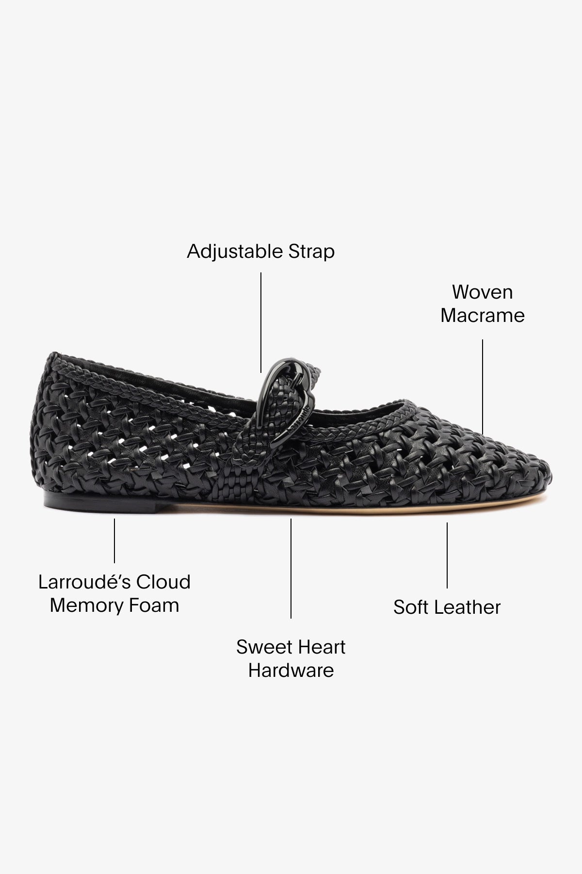 Our most comfortable flat yet, our newest Verona mary-jane takes cues from a Shakespearean romance. In an intricate woven macrame—and a sweet new heart buckle at the ankle strap—this black pair is a breath of fresh air.