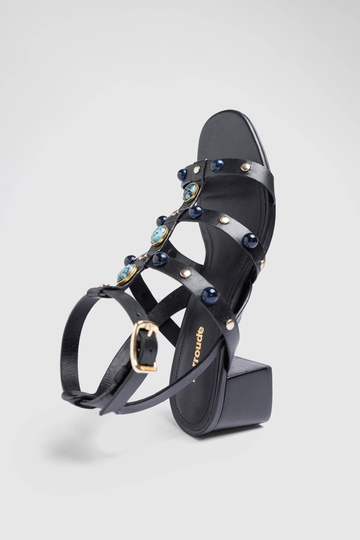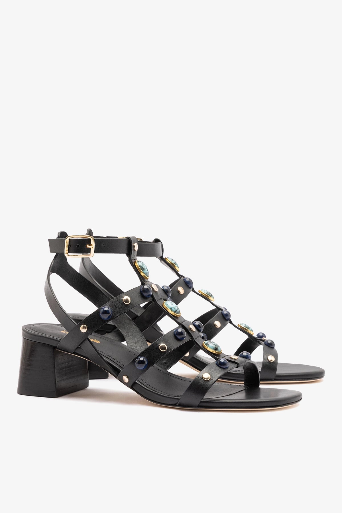 Black leather sandal featuring slim straps embellished with cabochon stones and gold-tone studs. Set on a structured block heel, the design combines statement detailing with a balanced silhouette for polished day-to-evening styling.