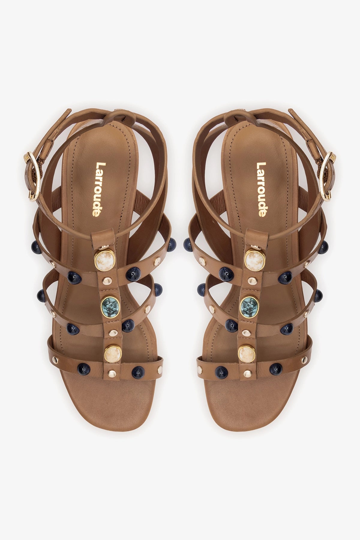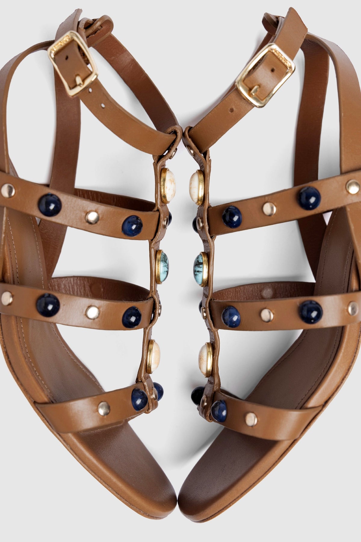 Caramel leather sandal featuring slim straps embellished with cabochon stones and gold-tone studs. Set on a structured block heel, the design combines statement detailing with a balanced silhouette for polished day-to-evening styling.