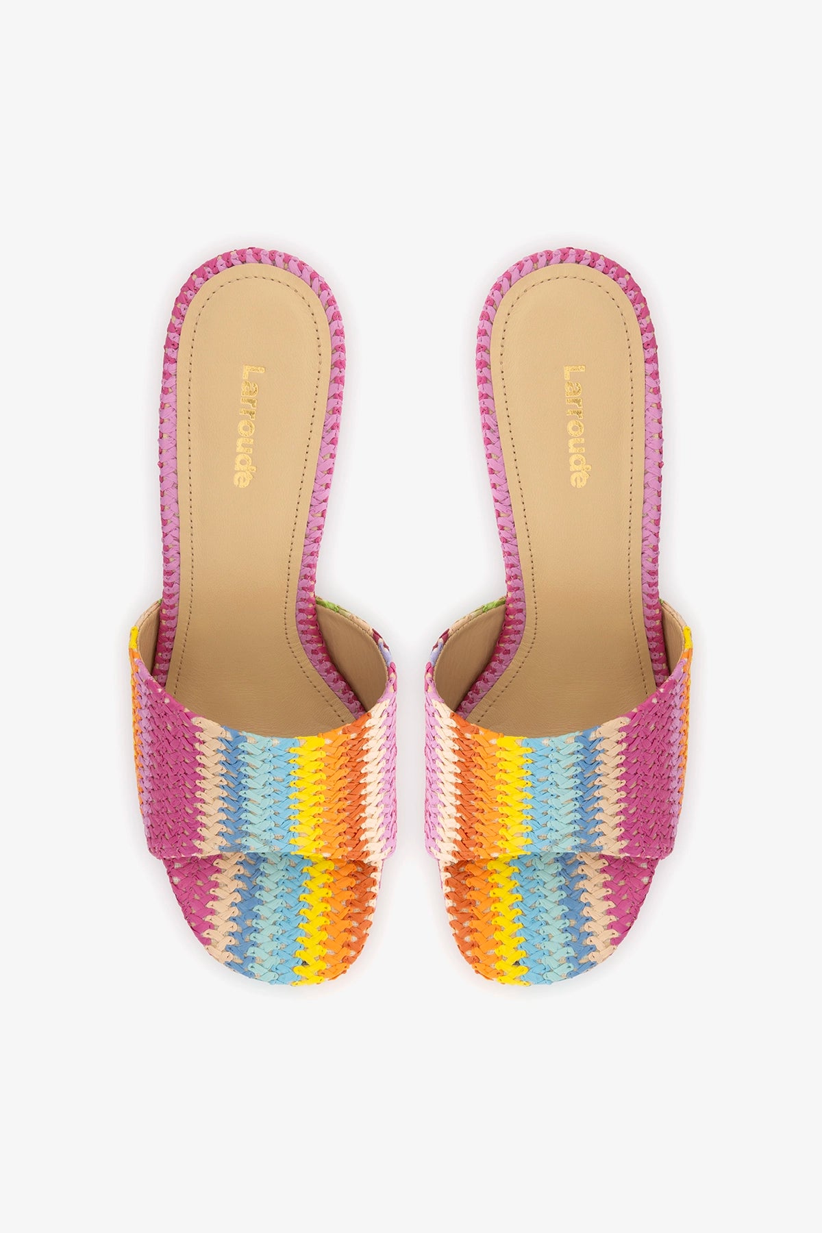Platform mule in rainbow woven raffia, with a wide front strap and block heel fully covered in the same material. The generous platform keeps you comfortable all day long.