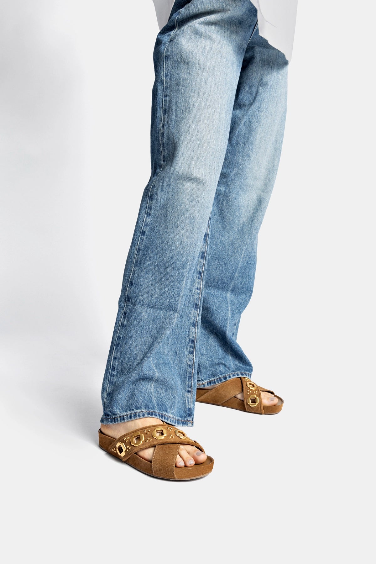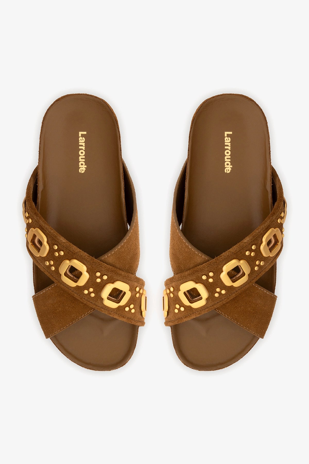 The Milan Slide is your elevated everyday statement piece. Reimagined in plush suede with crisscross straps, it defines effortless style with attitude. The metallic details frame the shoe, injecting a rock-chic edge into your comfort, making it essential for any season.