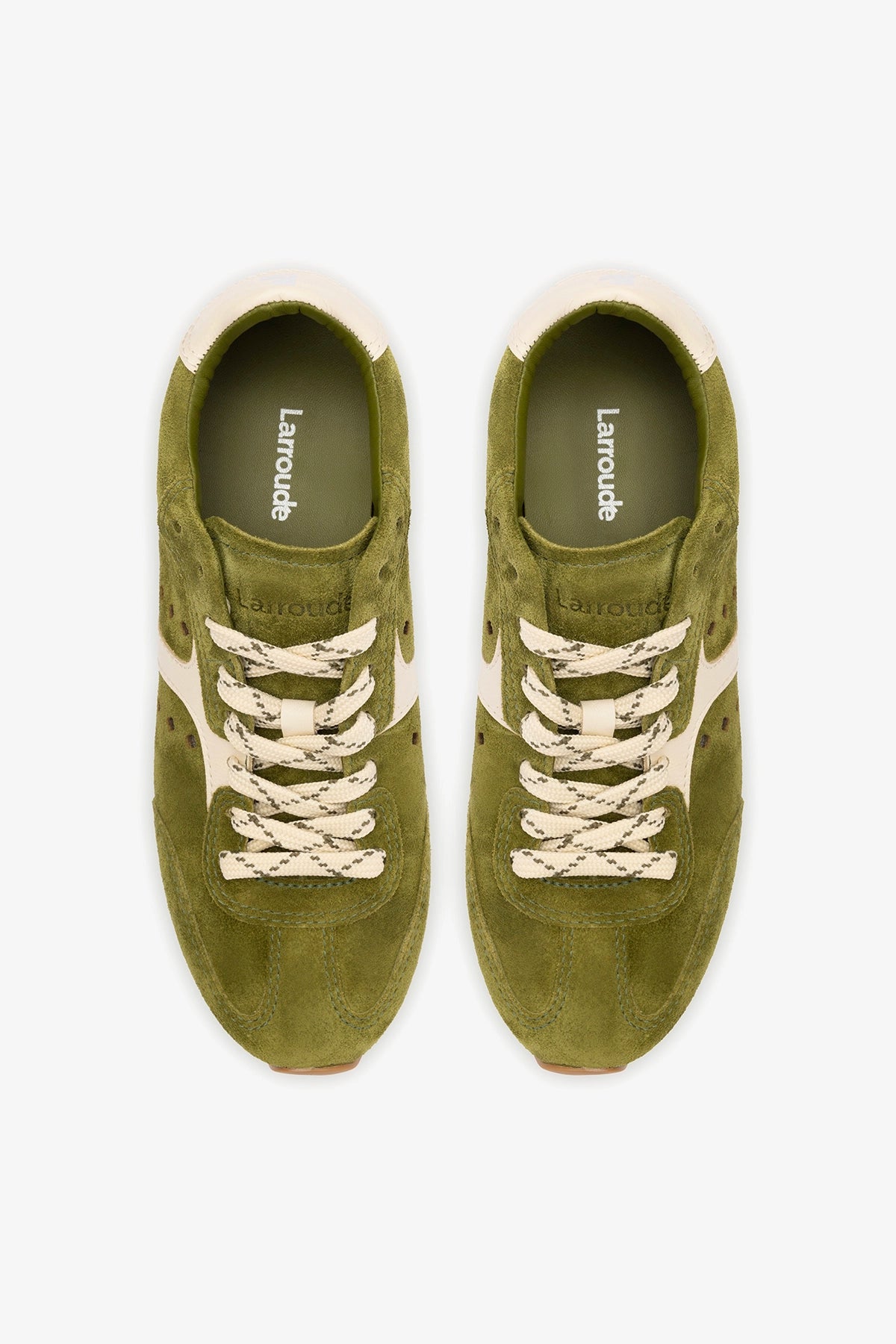 We're in our athletic era. Introducing the very first sneaker by Larroudé, the Stella blends functionality and form with fashion, in a rich green suede that you can wear with anything from day dresses and denim to workout gear at