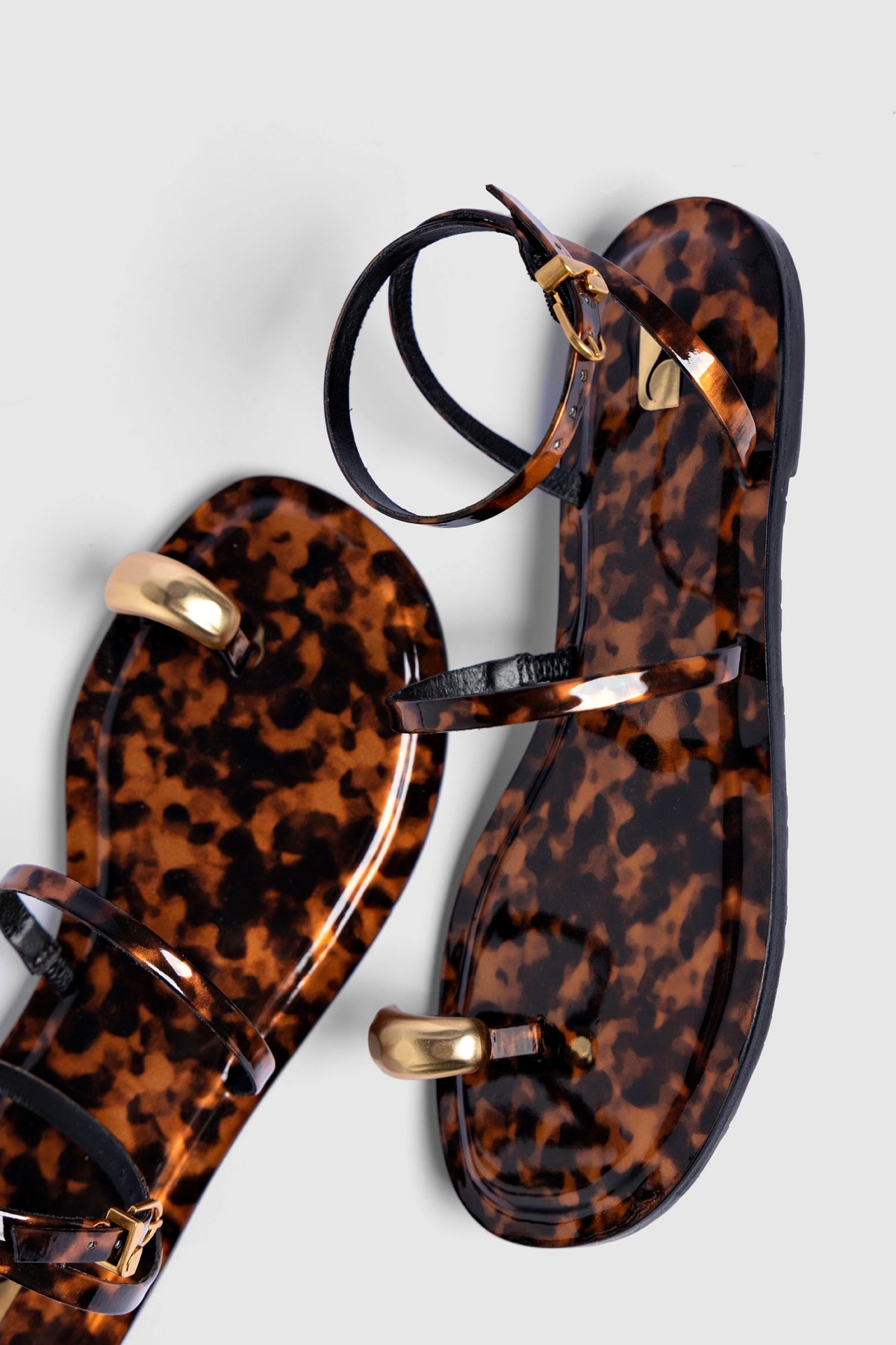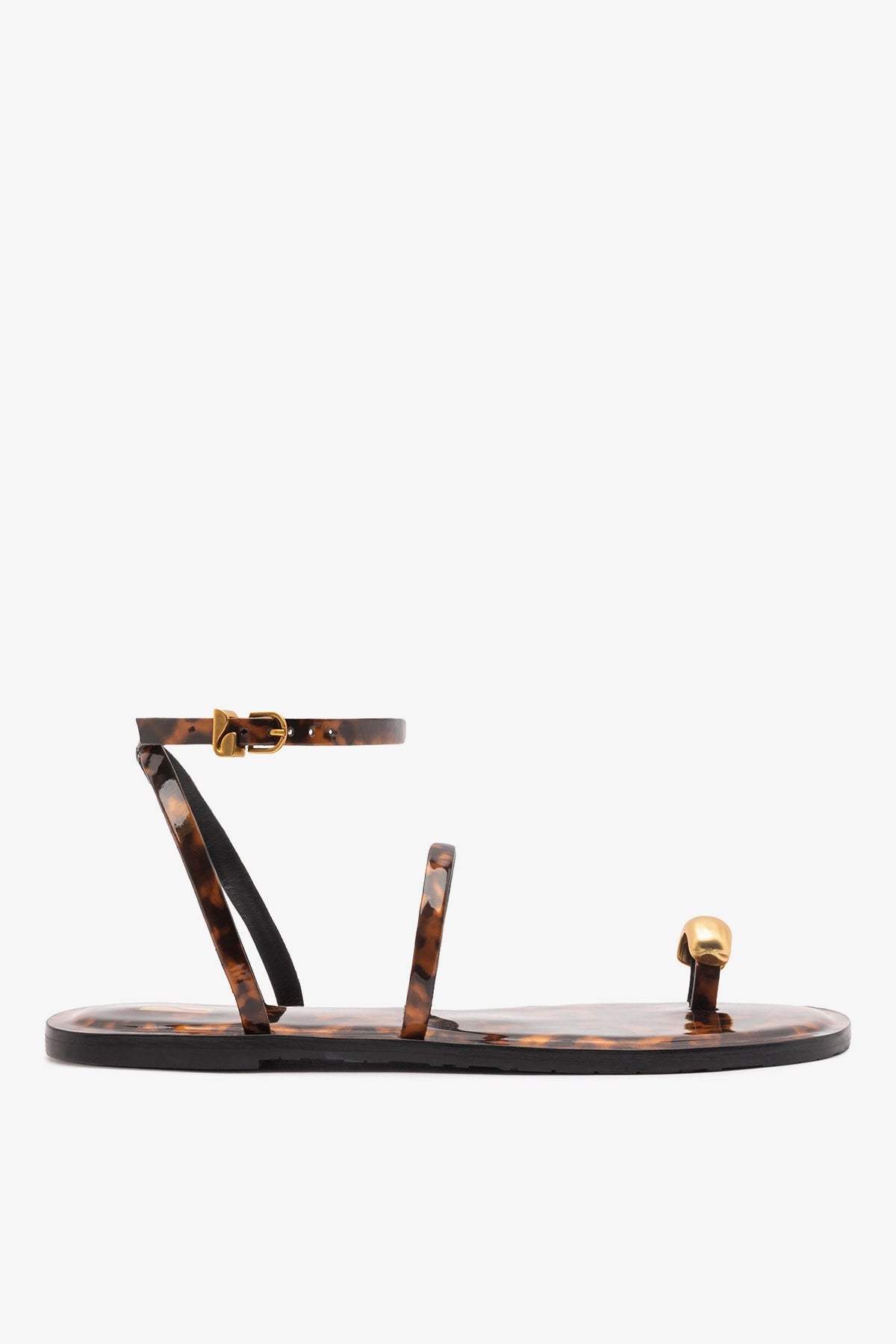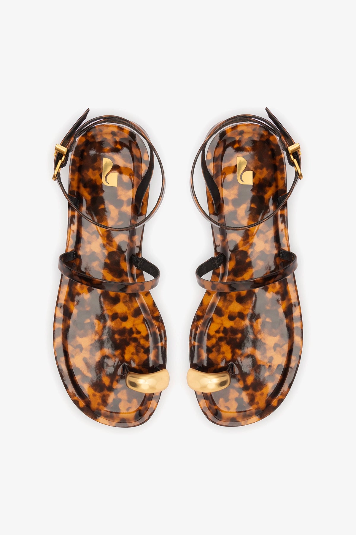 Flat sandal in tortoise patent leather with a gold toe ring. The minimalist silhouette is set on a flat sole with an adjustable ankle strap for a secure fit—an effortless option for warm-weather styling.